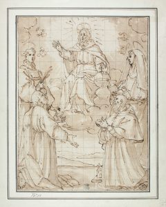 Penna e inchiostro, tracce lievi di matita nera; quadrettatura a matita nera; carta bianca a vergelle. Foglio: mm 285x215. Supporto: mm 365x295. Disegno proveniente dalla collezione di Jules Dupan di cui è presente il timbro nell 'angolo in basso a destra (Lugt 1440) venduta nel 1840. Sul supporto, sia dal recto che dal verso sono numerose iscrizioni manoscritte a matita di grafite e a penna e inchiostro rosso-rosa (dal sec. XIX al XX) sia in lingua italiana che francese, in cui si cita anche il nome del Pierre Hénault (“deputé 1949”). Tre dei quattro santi presenti si possono forse identificare in Santa Chiara, S. Stefano, S. Bartolomeo, inginocchiato in basso a sinistra. Disegno da lavoro, con quadrettatura originale eseguito con grande sicurezza e mano libera. Di sicura provenienza fiorentina, oltre che a Jacopo Chimenti, detto l 'Empoli, è stato attribuito anche ad Annibale Carracci. Il foglio antico è in ottime condizioni di conservazione, nonostante sia interamente incollato ad un cartoncino grigio-ceruleo (sec. XVIII-XIX), a sua volta fissato ‘a finestra ' lungo i bordi del verso ad un supporto cartaceo (sec. XIX) e profilato da 4 linee di cornice a penna. Anche il foglio antico presenta 4 linee di cornice lungo i bordi.