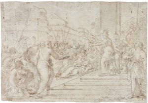 Penna e inchiostro, inchiostro acquerellato marrone, matita nera; carta bianca a vergelle filigranata (metà destra del foglio: corona e stella iscritta in cerchio). Foglio: mm 263x380ca. Verso destra in basso in grafia ottocentesca l 'iscrizione manoscritta a penna e inchiostro “Donducci Giov. Andrea/ detto Mastelletta”. Forte sembrerebbe l 'influenza di Pietro da Cortona. Il foglio mostra i segni di un restauro integrativo delle zone più consunte della carta e del disegno che in alcuni punti è stato ritoccato.