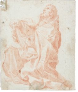 Matita rossa, carta bianca a vergelle pesante. Foglio: mm 185x154. Foglio non in perfette condizioni ma il disegno è intatto. Forse una controprova. Il foglio presenta alcuni piccoli strappi, spellature e lievi mancanze, macchie oleose e sporcizia diffusa. Al verso, tracce consistenti di precedenti incollaggi a un cartoncino azzurro.
