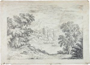 Anonimo romano del XVIII secolo, Paesaggio lacustre o fluviale con barche, figure e piccolo borgo.