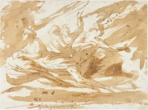 Penna e inchiostro acquerellato, su tracce di matita nera; carta bianca a vergelle . Foglio: mm 168x228. Al verso uno studio di figura a matita nera e un 'iscrizione antica (sec. XVII): “ Due asini che bevono. E già siamo 3.” Opera che potrebbe ascriversi ad un artista minore, ma di qualità di ambito reniano. In ottime condizioni di conservazione: al verso sono presenti alcune macchie e gocciolature dello stesso inchiostro del disegno antico, e tracce diffuse di polvere di matita rossa.