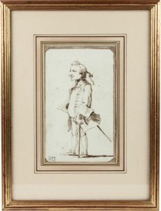 Penna e inchiostro acquerellato; carta bianca a vergelle. Foglio: mm 186x115. Il disegno proviene dalla raccolta fiorentina di Giorgio Franco (Lugt 4194) a cui si riferiscono sia il timbro in basso a sinistra del recto, sia il timbro sul verso del supporto cartaceo (sec. XX) su cui sono alcune iscrizioni manoscritte in calligrafia recente. UNITO CON: Cornice (sec. XX, prima metà) (mm 327x247). Il disegno è in ottime condizioni di conservazione; è profilato da due linee di cornice a penna e da un riempimento interno ad acquerello. è incollato dal bordo superiore del verso a un cartoncino grigio azzurro (sec. XX) a sua volta incollato ad un passe-partout di epoca moderna. Sul verso del supporto tracce di colle e scotch.