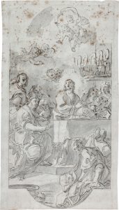 Penna e inchiostro anche acquerellato, carta bianca a vergelle fine, con filigrana (grande scudo coronato con ricca cornice e due medaglioni, uno con emblemi araldici e l 'altro le lettere “DC”); il verso è cosparso di polvere di pietra rossa. Le figure e la composizione è ripassata con una punta. Il foglio è stato chiaramente calcato ed è forse una copia coeva da un dipinto non identificato. Il foglio reca un 'attribuzione a Domenico Mondo, che fu attivo anche nella reggia di Caserta. In buone condizioni, a parte un foxing diffuso nella parte alta e piccole strisce di carta al verso, poste a rinforzo del bordo superiore.