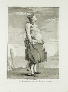 Acquaforte e acquatinta. mm 240x165. Foglio: mm 295x225. Newcome Schleier - Grasso, n. 17 a (secondo stato con aggiunta dell'acquatinta). Dalla serie Divers portraits gravés à l'eau-forte et dediés à Mr. Dominique Corvi peintre celebre par Jean David Genois son élève, à Venise, 1775, affascinante suite di acqueforti raffiguranti maschere e soggetti popolari eseguite dall 'artista durante il periodo veneziano che sì svolse sotto la protezione di Giacomo Durazzo, ambasciatore imperiale a Venezia. La maggior parte delle incisioni del David furono pubblicate dal Suo mecenate Giacomo Durazzo a Venezia e sono pervase dalla teatralità e sofisticatezza che caratterizzava la cultura della città veneta nel sec. XVIII. La serie dei Divers Portraits è importante anche per l'inserimento della tecnica dell'acquatinta nell'ambito della produzione calcografica settecentesca italiana. -