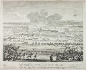Acquaforte e bulino. mm 360x440. Margini a filo dell 'impressione della lastra. Sotto l 'inc.: “Basilio Lasinio Alfiere Veneto dal vero disegnò - Carlo Lasinio seniore incise in Firenze”. Titolo in basso al centro. Legende ai lati. Basilio Lasinio (Treviso 1766-1839), fratello minore dell 'incisore Carlo, fu artista trevigiano tra gli ingegneri geografi di Napoleone Bonaparte. Titolo completo dell'opera: Prospetto della città di Mantova dalla parte del Borgo S. Giorgio e della Cittadella / Assediata dall 'Armata francese e bombardata dalla Porta Ceresa verso la fine dell 'Agosto 1796, quindi bloccata fino a 2 Febbraio 1797 nel qual giorno si rese alle armi francesi per Capitolazione del Feld. Maresciallo Wurmser.