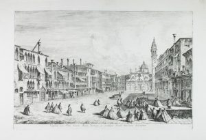 Acquaforte. mm 315 x 471. Foglio: mm 460x660. Mauroner, 3; Succi, 13. I stato su 4. Al centro, lungo il margine inferiore, titolo in latino esplicativo del soggetto rappresentato. A destra "Mich.l Marieschi del.t et inc.t". Fa parte della serie di 21 vedute di Venezia intitolata Magnificentiores Selectioresque Urbis Venetiarum Prospectus, a cui Marieschi lavorò tra il 1738 e il 1741. Esemplare privo del n. 18 che venne aggiunto nel II stato e riportato nel III. Bellissimo esemplare, fresco e a margini molto ampi. Presenta solo piccoli vecchi restauri ai margini e due piccole macchie sul bordo superiore.
