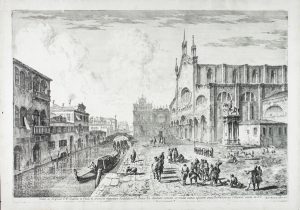 Acquaforte. mm 305x440. Foglio: mm 340x485. Mauroner, 13; Succi 22. I stato su 4. Al centro, lungo il margine inferiore, titolo in latino esplicativo del soggetto rappresentato. A destra "Mich.l Marieschi del.t et inc.t". Fa parte della serie di 21 vedute di Venezia intitolata Magnificentiores Selectioresque Urbis Venetiarum Prospectus, a cui Marieschi lavorò tra il 1738 e il 1741. Si tratta di uno dei fogli più belli e riusciti. Esemplare privo del n. 15 che venne aggiunto nel II stato e riportato nel III. Bellissimo esemplare, molto fresco e in prima tiratura. insignificanti difetti ai margini, ma ottima conservazione.