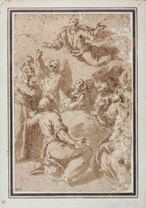 Penna e inchiostro acquerellato, su tracce di matita nera; carta fine a vergelle tinta e preparata. Foglio: mm 250x165. Supporto: mm 295x210. Al verso del supporto il numero “7” penna e inchiostro (sec. XVII-XVIII). Il foglio è datato in basso a sinistra a penna “1622”. Opera perfettamente riconoscibile, di Palma il Giovane e datata 1622. Non in perfetto stato di conservazione (molte mancanze soprattutto lungo i bordi), è interamente incollato (controfondato) ad un cartoncino azzurro pesante a vergelle (sec. XVII-XVIII) e profilato da due linee a penna e inchiostro di larghezza diversa.