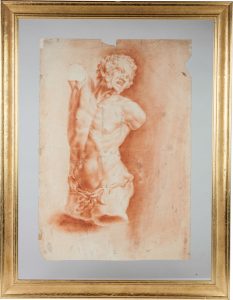 Matita rossa, anche lievemente inumidita, su carta bianca. Foglio: mm 420x287. UNITO CON: Cornice in legno intagliato e dipinto (sec. XX) con vetro di protezione (mm 560x430). -