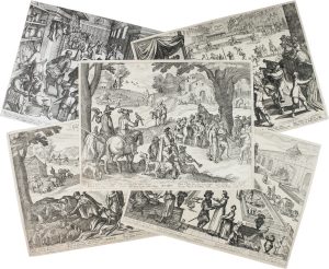 Serie completa di 12 acqueforti. mm 195x275. Primo stato su 2 prma dell'indirizzo di van Aelst. (12). Belle impressioni in generale buono stato di conservazione. Rifilate a qualche millimetro oltre l'impressione della lastra, la prima a filo della parte incisa. Una mancanza di circa 25 mm all'angolo inferiore sinistro del mese di luglio, altre più insignificanti ai bordi di qualche foglio. Una piega d'impressione al centro del mese di settembre.