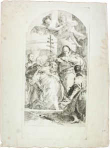 Acquaforte. mm 453x224. Foglio: mm 500x370. Rizzi, n. 134. Esemplare molto raro nel primo stato su 3, prima dell'iscrizione e del numero. Da una pala di Giambattista Tiepolo eseguita nel 1759 per la chiesa di Folzano. Bella impressione su carta vergellata con filigrana "tre mezzelune". Ampi margini intonsi, con lievi macchie fungine.