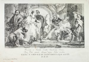 Acquaforte. mm 255x360. Foglio: mm 280x393. Rizzi, n. 105. De Vesme, 74. Secondo stato di 3 con l'iscrizione in basso ma senza il numero 55. Da una tela di Giambattista Tiepolo oggi al museo di Francoforte. Una piccola macchia bruna nell'inciso in basso verso sinistra e una rosata all'estremità inferiore del foglio, altrimenti ottima conservazione.