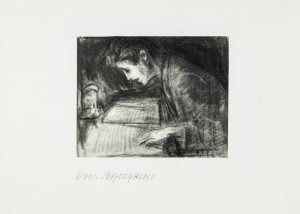Carboncino. mm 85x120. Siglato in basso a destra con le iniziali “DB”. Eseguito su foglio di taccuino con due fori laterali. -
