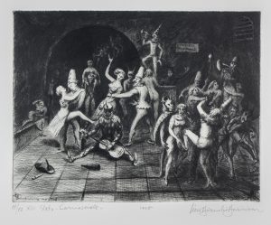 Acquaforte e puntasecca. mm 230x295. Foglio: mm 500x700. Firmata e datata in lastra in basso a sinistra. Firma, data 1945, titolo e tiratura a matita in basso. Es. n. 11/12 con indicazione di XIII° stato. Insieme a Una tazza di tè è tra le più significative e ricercate incisioni di Bianchi Barriviera eseguite negli anni della guerra e dominate dall 'irrazionale, dal bizzarro e dal macabro. Perfetto esemplare.
