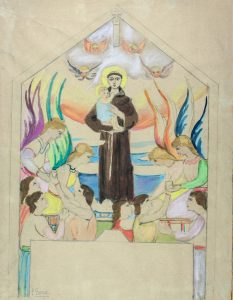 Tempera su carta. mm 450x345. Firmato a matita in basso a sinistra. Probabilmente legato alla decorazione della cappella dedicata a Sant'Antonio da Padova nella chiesa di San Giovanni Battista alla Creta di Milano affrescata sotto la direzione di Pompeo Borra, con la collaborazione della pittrice Lisa Sotili (Sotilis). Incollato su supporto di cartone.
