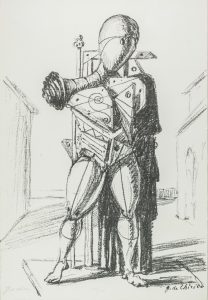 Litografia mm. 385x280. Foglio mm. 420x286. Ciranna 129. Firmata nella pietra in basso a destra. Firmata e numerata a matita. Es. n. 28/100 appartenente alla tiratura in nero. Della stessa fu fatta una tiratura a colori di 120 esemplari fatta dall 'Edizione Rotografica Romana per la cartella Dessins par G. De Chirico di R. Sistu, Parigi 1964. Applicata con linguette a un fondo di cartoncino. -