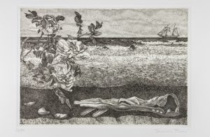 Acquaforte. mm 210x295. Foglio mm 395x495. Titolo inciso in basso a sinistra. Firmata e numerata a matita in basso ai lati. Es. n. 26/99. Il guanto, il mare, le rose sono una chiara evocazione del celeberrimo Un guanto di Max Klinger. Per Leonardo Sciascia, il talent-scout di Faro, "i suoi paesaggi incisi sono sempre e troppo oggettivi perché lì si possa considerare realisti o veristi" mentre per Gesualdo Bufalino "il privilegio più sottile dell'arte di Faro sta nel conferire il bagliore di un oltre ad ogni suo componimento, riconfermando così I'antica figura dell'incisore, come innocuo negromante ed alchimista, che con la semplice arma d'un bulino, nel suo minuscolo antro - laboratorio, soffiando su una creta sordomuta, riesce a estrarre il miracolo dell' oro ed il soffio d'una incorruttibile vita". Perfetto esemplare.