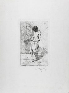 Acquaforte. mm 170x110. Foglio: mm 325x245. Vives i Pique-Cuenta Garcia,13. Firmata sulla lastra in alto a sinistra «Fortuny / Roma». Timbro riproducente la firma dell'artista in basso a destra. Esemplare appartenente alla seconda tiratura “avant la lettre” (1878) su 6, impressa su carta Cina. Non è datata ma viene considerata una delle prime incisioni all'acquaforte eseguite da Fortuny. Secondo Davillier essa fu realizzata dopo Tanger (n. 17) e Famille Morocaine (n. 9). Bellissima impressione dal tratto fine e dalle linee molto profonde nelle zone d'ombra. Fioriture sparse, per il resto ottima conservazione. Provenienza Henriette Fortuny.