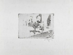 Acquaforte e leggera acquatinta. mm 110x160. Foglio: mm 248x325. Vives i Pique-Cuenta Garcia, 20. Timbro riproducente la firma dell'artista in basso a destra. Esemplare appartenente alla seconda tiratura (1878) su 5, impressa su carta Cina. Provenienza Henriette Fortuny. Ottima conservazione.
