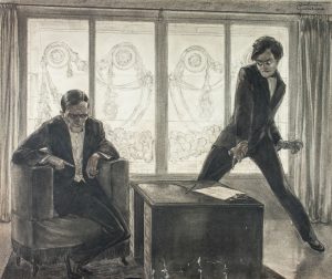 Carboncino e pastello su cartone. mm 415x495. Firmato in alto a destra: “Constantin Grondona”. Incisore, pittore, illustratore di libri e disegnatore di vetrate artistiche con la ditta Beltrami & C. di Milano e Testori di Brescia. Illustrò con Marius Pictor e Alfredo Montalti la Historia della mia fuga dai piombi di Giacomo Casanova. Nel 1913 partecipò all 'Esposizione d 'Arte Umoristica di Bergamo. Nel 1934 tenne una personale alla Galleria Dedalo di Milano presentato da Giovanni Buffa, il suo maestro. P. Pallottino, Storia dell 'illustrazione italiana, Bologna 1988, pp. 145 e 222. Lievi striature in basso.
