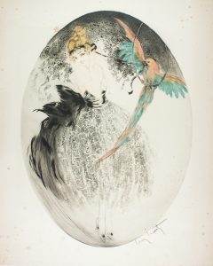 Louis Icart , Donna con pappagallo. Donna con colombe. 1922
