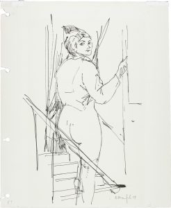 Penna e inchiostro di china su cartoncino mm 297x245. Firmato e datato a matita. Il disegno è delineato sulla facciata bianca di un foglio di registro stampato che reca fori di inserimento sul lato sinistro. Frammenti di carta incollata sul bordo superiore. Il titolo si ricava da un cartoncino in origine dietro la cornice. -
