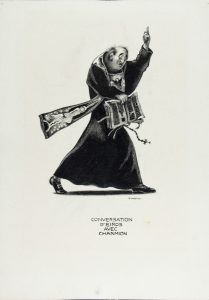 Penna e inchiostro di china. mm 255x180. Firmato in basso a destra, Titolo sotto al centro. Datato 1906 al verso. Ispirato a un passo del racconto di Poe: “I teologi, con gravità stimolata dal terrore, indugiavano sulle profezie bibliche, e le spiegavano alla gente con una chiarezza e semplicità di cui non si conosceva esempio nel passato”. Martini realizza con ironia un frate savonaroliano che lancia anatemi trasformando il terrore profetico in una satira anticlericale. Alberto Martini illustratore di Edgar Allan Poe, con scritti di J. CortÁzar, R. Tassi, M. Lorandi, Milano 1984, scheda a p. 226. -