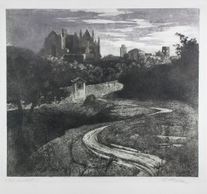 Acquaforte e acquatinta. mm 390x444. Foglio: mm 500x745. Firmata e titolata a matita in basso, senza indicazione di serie (forse 1917 o 1923). Una delle più suggestive incisioni crepuscolari di Prencipe. Ottimo esemplare.