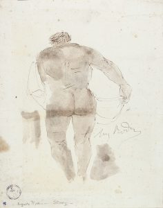 Penna e inchiostro bistro acquerellato. mm 280x230. Firmato a penna a destra verso il basso. Scritta a penna sul bordo inferiore “Auguste Rodin - Study”. Due timbri di collezione non identificati. Altra scritta sul supporto di cartone: “Ex Collezione Morosini”. Una macchia di untuosità sul lato sinistro, lievi ingialliture.
