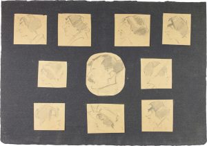Matita nera, disegni di misure varie (mm 70x80 ca. cad.). Firmato con le iniziali a matita in basso a destra della caricatura centrale. Montate a serie su un unico cartoncino nero. -
