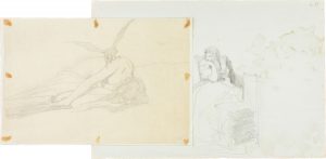 1) Donna seduta. Matita di grafite. mm 255x375. 2) Figura femminile giacente con un corvo sulle spalle. Matita di grafite su velina incollata su carta. mm 200x300. (2). Il numero 1 presenta una goratura d'acqua, il numero 2 macchie brunastre in corrispondenza dell'incollatura.
