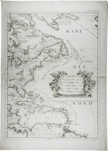 Incisione in rame. Mm 625x460, con margini. Presente la sola parte orientale, che rappresenta l'America del Nord centrale, il centro America, i Caraibi e una piccola parte del Sud America. Cartiglio con le distanze nelle varie misure al centro dell'Oceano Atlantico. Bella carta geografica con solo lievi pieghe al centro.