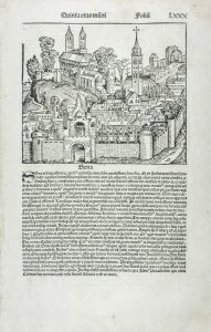 Xilografia originale. mm 190x225. Foglio: mm 453x295. Bella veduta di Siena dal foglio LXXX della famosa opera del Liber Chronicarum edito nel 1493. Al verso testo stampato. Ottima conservazione.