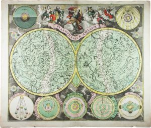 Incisione in rame con bella coloritura coeva. Mm 498x580. Margini: mm 535x625. Titolo in alto al centro. In alto sfera dell'alternanza del giorno e della notte, in alto a destra sfera delle fasi lunari. Tratto dall'opera di Mattheus Seutter, Atlas Novus sive Tabulae Geographicae totius orbis faciem, partes, imperia, regna et provincias exhibentes exactissima cura iuxta recontissimas observation, 1740. Splendide condizioni.