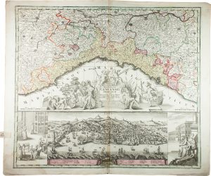 Incisione in rame con coloritura coeva. mm 505x585, con margini. Titolo in altro al centro con figure allegoriche, sotto pianta della città di Genova con a fianco 2 piccole vedute. Tratto dall'opera di Mattheus Seutter, Atlas Novus sive Tabulae Geographicae totius orbis faciem, partes, imperia, regna et provincias exhibentes exactissima cura iuxta recontissimas observation, 1740. Alcuni restauri e arrossature al centro della piegatura centrale.