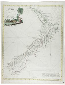 Incisione in rame in coloritura coeva. Mm 455x362, con piccoli margini. Titolo in alto a sinistra entro cartiglio decorato. Incisione disegnata da Pasquale. Bella e rara carta della Nuova Zelanda, una delle prime rappresentate dopo il viaggio di Cook. -