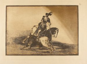 1814-1816. GOYA Y LUCIENTES, FRANCISCO DE: CARLOS V LANCEANDO UN TIRO EN LA PLAZA DE VALLADOLID. Aguafuerte, aguatinta, punta seca y buril. 24,5x34,5 cm. Plancha 10 de La Tauromaquia. Sexta edición, Harris 213. Sello circular en seco con el retrato...