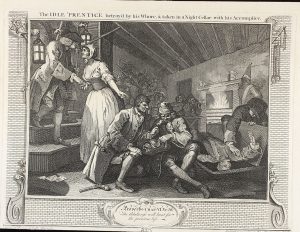 1747. HOGARTH, W.: THE IDLE PRENTICE BETRAY´D BY HIS WHORE & TAKEN IN A NIGHT CELLAR WITH HIS ACCOMPLICE. Grabado al cobre, 26,5x35 cm. Plancha 9 de la Serie Industriosidad y Pereza.