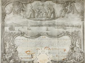 1756. (ACCION-BARCELONA). TRAMULLAS, EMMANUEL; VALLS, IGNACI: ACCIÓN DE LA REAL COMPAÑÍA DE COMERCIO ESTABLECIDA EN BARCELONA. Barcelona, 30 de mayo de 1756. 29 x 37,5 cm. Acción extendida a nombre del Sr. Phelipe Wits por valor de 250 pesos de...