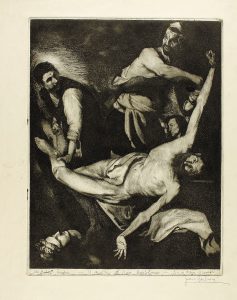 1960 ca. BARBARA, JOAN: EL MARTIRIO DE SAN BARTOLOMEO. Aguafuerte, a partir de una obra de Ribera, el Españoleto. Placha 30x22,5 cm, papel. 43x32,2 cm. Placha muy marcada. Firma manuscrita del artista.