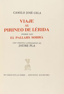 1965. (BIBLIOFILIA). CELA, CAMILO JOSE; PLA, JAUME [grabador]: VIAJE AL PIRINEO DE LERIDA. Primer País EL PALLARS SOBIRÁ. Segundo país EL VALLE DE ARÁN. Tercer país EL CONDADO DE RIBAGORZA. Barcelona: Sociedad Alianza de Artes Gráficas de...