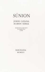 1991. (BIBLIOFILIA). CATAFAL, JORDI; SERRA, RAMON [ilustrador]: SÚNION. ´HOMENATGE AMB MOTS´ DE RAMÓN PLÀ I ARXÉ. Barcelona: 1991. Folio mayor. Hojas sin numerar, pliegos cosidos. Ilustr. con 12 grabados de Jordi Cafatal. Grueso papel de hilo...