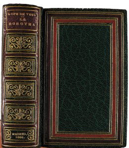 1886. (LITERATURA-ENCUADERNACION). VEGA, LOPE DE: LA DOROTEA. ACCION EN PROSA. Madrid: Imp. de Perez Durbrull, 1886. 12º. 478 p., 1 h., 2 retratos del autor. Enc. firmada por A. PALOMINO en plena piel, hilos, cortes dorados. Camisa en piel.