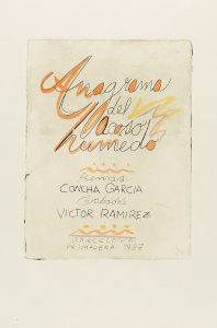 1987. (LIBRO-OBJETO). RAMIREZ, VICTOR [texto]; GARCIA, CONCHA [artista]: ANAGRAMA DEL ACOSO HUMEDO. Barcelona: Ed. Galeria; Edicions Aixa, 1987. Folio menor. 8 p. en acordeón. Grueso papel de hilo con barbas. Cubiertas en cartoné ilustradas con...