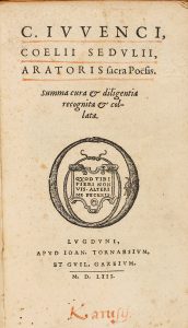 1553. (LITERATURA). C. IVVENCU COELII SEDULII ORATORI SACRA POESIS. Lugduni: apud Ioan. Tornaesium et Guil Gazeium, 1553. 12º. 316 p. Marca tipográfica en portada. Subrayados de anterior poseedor. Enc. desprendida en pergamino.