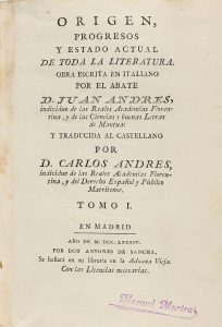 1784-1804. ANDRES, JUAN: ORIGEN, PROGRESOS Y ESTADO ACTUAL DE TODA LA LITERATURA. Madrid: Antonio de Sancha, 1784-1795. 8 vols. en 8º mayor. I: 6 h. + XXIII + 5 h. + 482 p.; II: 8 h. + 492 p.; III: XXIV + 3 h. + 428 p.; IV: 5 h. + 551 p.; V: 7 h....