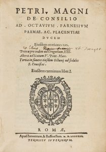 1587. (HISTORIA). PETRI MAGNI DE CONSILIO AD OCTAVIUM FARNESIUM PARMAE AC PLACENTIAER DUCEM. Romae: apud Zannettum & Russinellum, 1587. 8º mayor. 4 h. + 100 p. Capitales. Subrayados de anterior poseedor. Enc. en pergamino.