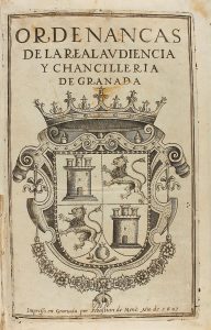 1601. (GRANADA). ORDENANCAS DE LA REAL AUDIENCIA Y CHANCILLERIA DE GRANADA. Impresso en Granada: por Sebastian de Mena, 1601. Folio. 6 p. + 438 p., 43 h., 1 h. Portada con grabado calcográfico a plena página con escudo real de los Reinos de...
