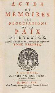 1707. (HISTORIA). ACTES ET MEMOIRES DES NEGOTIATIONS DE LA PAIX DE RYSWICK. La Haye: chez Adrian Moetjens, 1707. 5 vols. en 8º menor. I: 24 h. + LXXV + 587 p., 12 h.; II: 8 h. + LXIV + 581 p., 9 h., 2 grabados y 6 estados plegados; III: 8 h. + 499...