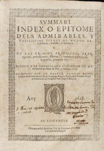 1628. (CATALUNYA-HERALDICA). SUMMARI, INDEX O EPITOME DELS ADMIRABLES, Y NOBILISSIMS TITOLS DE HONOR DE CATHALUNYA, ROSSELLO Y CERDANYA Y DE LES GRACIES, PRIVILEGIS, PRERROGATIVES, PREHEMINENCES, LLIBERTATS, E INMUNITATS GOSAN ... Perpinyà: Pere...